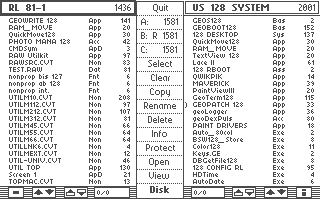 The UTIL TOP screen with the file menu. Two windows for two drives and a button-bar at the middle. The top will show the diskname and the number of free blocks on disk. Files are shown with name, type and size in diskblocks.